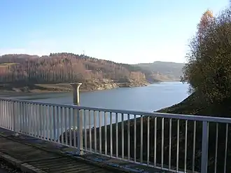 Le réservoir supérieur est situé à une altitude de 848,4 m. Il est retenu par un barrage annulaire ovale haut de 26 m et long de 2590 m, au sommet de la colline de Hundsmarter qui a été nivelée pour la construction de l'ouvrage. Ce barrage en remblai avec joint extérieur asphalté est le plus grand barrage de Saxe avec un volume de 3.500.000 m³. La surface du plan d'eau est de 43,6 ha et le volume de stockage d'environ 6,5 millions de m³.