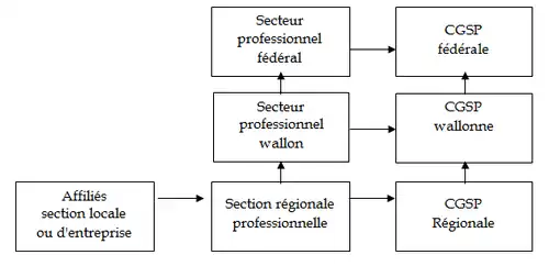 L'IRW-CGSP est structurée au niveau des secteurs professionnels (poste, cheminots, etc.) afin de déterminer les relations entre les sections locales, régionales et nationales au sein de chaque secteur. Cet organigramme est basé sur les statuts et règlements d'ordre intérieur de la CGSP et de l'IRW-CGSP. C’est ainsi que les secteurs représentent légalement les travailleurs dans les divers comités de négociation, de concertation, commissions paritaires…