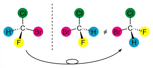 En chimie, un centre asymétrique décrit un atome qui, en vertu de ses substituants, ne peut pas être superposé à son image dans un miroir. En chimie organique, il s'agit souvent d'un atome de carbone d'hybridation sp3 possédant quatre substituants différents, comme dans l'exemple ci-contre.