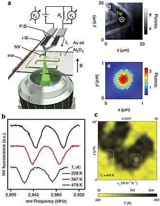 À l'aide d'un mécanisme semblable, des centres NV− ont été utilisés en microscopie thermique à balayage (en) pour établir des cartographies spatiales à haute résolution de température et de conductivité thermique[38].