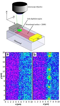 - ↑ (en) A. M. Edmonds, U. F. S. D’Haenens-Johansson, R. J. Cruddace, M. E. Newton, K.-M. C. Fu, C. Santori, R. G. Beausoleil, D. J. Twitchen et M. L. Markham, « Production of oriented nitrogen-vacancy color centers in synthetic diamond », Physical Review B, vol. 86, no 3, , article no 035201 (DOI 10.1103/PhysRevB.86.035201, Bibcode 2012PhRvB..86c5201E, lire en ligne)