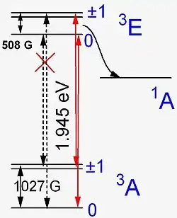 En considérant le centre NV− comme un système à plusieurs électrons, il est possible de le représenter par le diagramme ci-dessus, dans lequel les états sont indiqués par leur symétrie avec un exposant gauche valant 3 pour indiquer un état triplet (S = 1) et valant 1 pour indiquer un état singulet (S = 0). Il est bien admis aujourd'hui qu'on est en présence de deux états triplet et de deux états singulet intermédiaires[33].