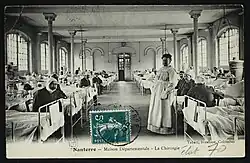 Fondée en 1887, la maison départementale de Nanterre avait pour objet d’abriter le dépôt de mendicité anciennement situé dans la prison de Saint-Denis, devenue trop exiguë[5]. Administrée par le préfet de la Seine, elle avait pour mission principale de recueillir les indigents de Paris et du département de la Seine, condamnés pour ou prévenus de délit de vagabondage. Ce dépôt de mendicité s'accompagnait d'un hospice de vieillards et d'une infirmerie[6].