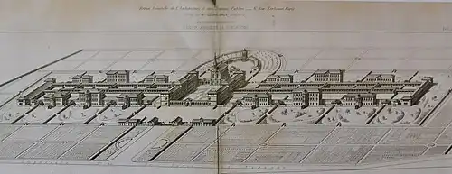 L’asile est structuré par un axe principal de symétrie reliant l’entrée, la cour d’honneur de l’administration, la chapelle, l’arrondi des services généraux, le château d’eau. De part et d’autre se développent les deux sections affectées aux deux sexes. Chacune comprend sept pavillons établis sur deux lignes liés par des galeries couvertes à l’administration, améliorations inventées par l’aliéniste Brière de Boismont. Recommandée par Esquirol mais généralement abandonnée pour son coût, la séparation thérapeutique absolue des quatorze quartiers a ici été obtenue.