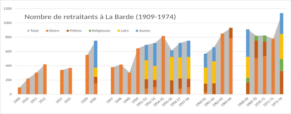 Les chiffres fournis par les archives de la Maison de retraites « Notre-Dame du Bon Conseil » de La Barde (Dordogne) permettent de suivre l’évolution d’un centre spirituel jésuite tout au long du XXe siècle, depuis sa fondation en 1909 jusqu’à sa fermeture en 1983. Lors de la phase de démarrage, la fréquentation atteint un premier seuil de 420 retraitants en 1912. Cette année, la maison est réquisitionnée comme ambulance auxiliaire de l’hôpital bénévole voisin ; elle reprendra son fonctionnement normal après 1916 seulement. Les années 1920 voient un nouvel afflux de retraitants : agriculteurs, jeunes gens de la croisade eucharistique ou de différents collèges, pères de famille, étudiants, prêtres ou séminaristes, mais aussi membres de l’ACJF et ouvriers. Un pic est atteint en 1930 avec 752 retraitants.