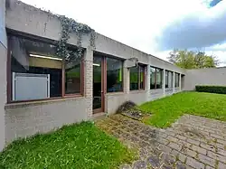 L'institut d'éducation physique par Charles Vandenhove, est une construction en béton apparent coulé sur place et de blocs de béton. Les toits en pente sont couverts de plaques ondulées en amiante grise, soutenues par une charpente de fermes en bois assemblées, libérant ainsi de vastes espaces pour les activités sportives. Les toits plats sont revêtus de gazon, abritant les espaces plus petits pour diverses utilisations et la circulation entre les cinq salles de sport.