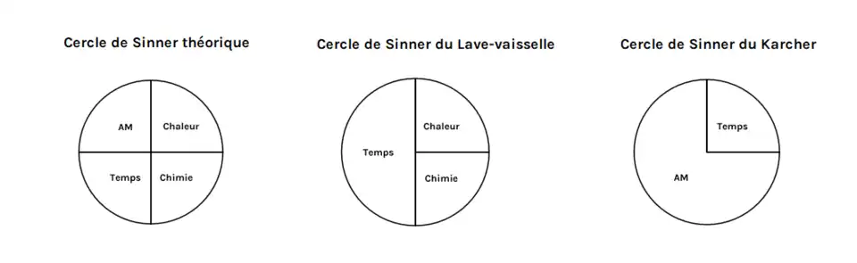 Si l'on applique cette théorique au lave-vaisselle et que l'on analyse son processus de nettoyage sous le prisme du cercle de Sinner, on considère seuls trois facteurs interviennent : le temps, qui est le facteur le plus important (les cycles de lave-vaisselle peuvent durer plusieurs heures pour une efficacité maximale), puis de la chaleur et de la chimie à parts égales[3].