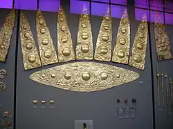 À noter une boîte hexagonale en bois, dont six feuilles d'or ont été conservées, attachées à la boîte. Deux sont décorées de motifs en spirale, deux autres montrent un lion chassant une antilope et les deux derniers montrent un lion chassant un cerf[36].