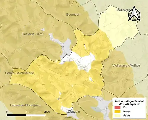 Le retrait-gonflement des sols argileux est susceptible d'engendrer des dommages importants aux bâtiments en cas d’alternance de périodes de sécheresse et de pluie[28]. 72,5 % de la superficie communale est en aléa moyen ou fort (59 % au niveau départemental et 48,5 % au niveau national)[Carte 4]. Depuis le , en application de la loi ELAN, différentes contraintes s'imposent aux vendeurs, maîtres d'ouvrages ou constructeurs de biens situés dans une zone classée en aléa moyen ou fort[Note 6],[29].