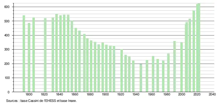L'évolution du nombre d'habitants est connue à travers les recensements de la population effectués dans la commune depuis 1793. Pour les communes de moins de 10 000 habitants, une enquête de recensement portant sur toute la population est réalisée tous les cinq ans, les populations de référence des années intermédiaires étant quant à elles estimées par interpolation ou extrapolation[34]. Pour la commune, le premier recensement exhaustif entrant dans le cadre du nouveau dispositif a été réalisé en 2005[35].