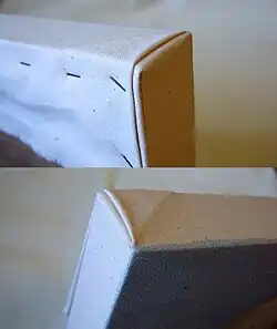 - la tension due à l’application de l’enduit, selon différentes formules : la toile détrempée par l’humidité de la préparation commence à se détendre, puis elle se tend à mesure que la préparation sèche et la colle contenue dans l’enduit assure la rigidité et le maintien des fibres textiles entre elles. Il peut arriver qu’une préparation trop vigoureuse ou trop chargée en colle entraîne un voilage de l’ensemble châssis-toile.