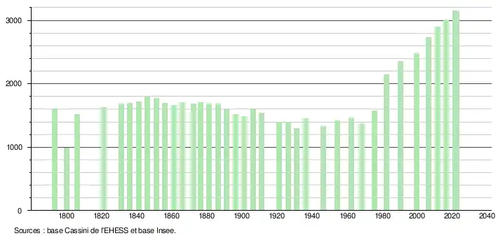 L'évolution du nombre d'habitants est connue à travers les recensements de la population effectués dans la commune depuis 1793. Pour les communes de moins de 10 000 habitants, une enquête de recensement portant sur toute la population est réalisée tous les cinq ans, les populations de référence des années intermédiaires étant quant à elles estimées par interpolation ou extrapolation[18]. Pour la commune, le premier recensement exhaustif entrant dans le cadre du nouveau dispositif a été réalisé en 2006[19].