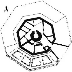 Au centre du château se dressait un donjon massif et octogonal comme le mur d'enceinte. Son côté mesurait environ 4 m[22]. Ses murs avaient une épaisseur de 2,20 m. Comme le mur d'enceinte, le donjon était constitué de pierres à bosses.