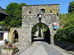 Les murs sont en grauwacke et en ardoise, les arcs en tuf volcanique. Des 4 niveaux, celui le plus bas comprend 2 salles avec des voûtes en berceau. Les bâtisses du château s'étendent à partir du donjon vers l'ouest sur une longueur de 200 m environ, dont une bonne moitié est occupé par le château principal.