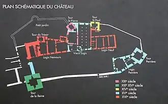 Sur le front nord, deux tours dites de « Saint-Pierre » et de « Saint-Paul », du XIIIe siècle, encadrent le « Vieux Logis » des XIIIe et XIVe siècles. Toujours au nord, le « logis neuf » et le « logis Nemours » disposées de part et d'autre du « Vieux Logis », sont des créations du XVIe siècle. Au sud-est, la « Tour et le Logis Perrière » ont été bâties entre 1445 et 1487[6]. La « Tour » érigée en 1455[6] remplace l'ancien donjon alors en ruine. Le chemin de ronde a été refait au XVIe siècle. La porte de la herse est une restauration de la fin du XIXe siècle, entre 1868 et 1873. Une tour du château a porté le nom d'Emyon[7],[note 4].