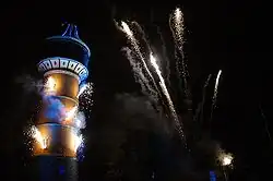 - Ce spectacle de 25 minutes était une création de la société Molécule de Sélestat, mêlant les images animées projetées, l'éclairage du château et des alentours, et un tir de feu d'artifice synchronisé par ordinateur sur des musiques parcourant le thème de l'eau. Des projecteurs étaient commandés au sol et sur le sommet de la tour, ainsi que des éclairages complémentaire à LED dans les ouvertures de la tour. Un éclairage coloré spécial comprenant un phare tournant est resté en service un mois.