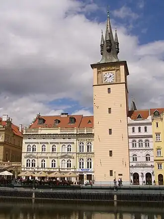 - (cz) Cet article est partiellement ou en totalité issu de l’article de Wikipédia en tchèque intitulé « Staroměstská vodárenská věž » (voir la liste des auteurs).