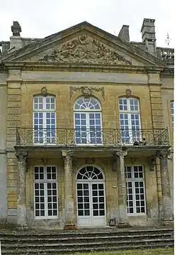La façade côté parc, de style Louis XIV[4] est couronnée d'un fronton triangulaire sculpté de figures féminines. L'étage est doté d'un large balcon sur portique central, et de têtes de macarons placées au-dessus des fenêtres.