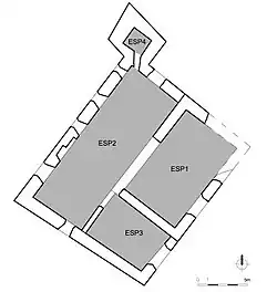 C'est depuis l'espace ESP 3 que l'on entrait dans le château, l'escalier à volées inversées desservant tous les niveaux des deux espaces dont le quatrième de ESP 1 par un escalier en bois dont il subsiste l'empreinte.