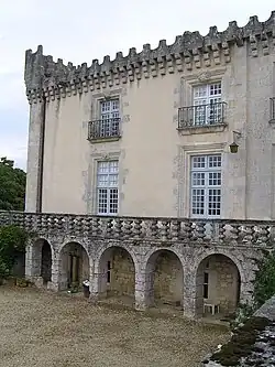 Des créneaux sur mâchicoulis surmontent les murs et cachent les toitures, selon une mode typiquement charentaise au début du XVIIe siècle ; cette mode fut initiée par Jacquette de Montbron — une charentaise — épouse du seigneur de Bourdeilles (frère de l'écrivain Brantôme), quand elle fit les plans du château neuf de Bourdeilles. Comme autres exemples de cette mode, nous avons Château Chesnel (à Cherves-de-Cognac), Bouteville, Villars-Marange (à Mérignac), Nanteuil (à Sers), un portail à Vouzan et deux portails à Juillac-le-Coq.