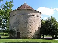 À droite, avant l'entrée, l'imposante fuie ronde comporte 2600 boulins. Elle est couverte d'un toit en poivrière avec trois lucarnes et date de 1553. Les armes des Ancelins sont visibles au-dessus de la porte.