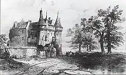 Le château de Kérouzéré (dessin d'Auguste Mayer et Eugène Cicéri publié en 1846).
