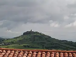 Le château occupe l'éminence d'un puy volcanique culminant à 699 m d'altitude. Le sommet, actuellement boisé (résineux), était encore découvert au début du XXe siècle.