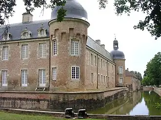 La construction comprend deux parties très nettement distinctes : d'une part les communs, et d'autre part le logis seigneurial. Chacune de ces parties est entourée de fossés remplis d'eau. On accède aux communs par un pont de pierre reliant le parc à ceux-ci, et au logis par un autre pont de pierre assurant la communication entre les deux ensembles. Ce second pont doit son originalité à quatre dès qui ornent ses extrémités et qui supportent, à l'ouest, deux lévriers, et à l'est, deux sphinx, et également pas ses parapets en fer forgé qui se prolongent de part et d'autre de la terrasse sur laquelle se trouve le château.