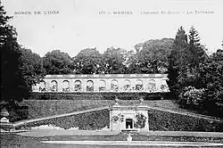 Dans les jardins, la double terrasse monumentale du XVIIIe siècle est attribuée à Pierre Contant d'Ivry; il s'agit d'un véritable théâtre de pierre et de verdure dominant le château et l'Oise. La terrasse et ses salles souterraines sont inscrites depuis 2001 à l'Inventaire supplémentaire des monuments historiques ainsi que le bassin elliptique, et les deux petits pavillons restaurés par Louis-Charles Boileau dans le style de la pagode de Chanteloup[10]. Quant au parc paysager, qui comprenait plusieurs pièces d'eau et de nombreuses fabriques aujourd'hui disparues, il aurait été créé par Louis-Sulpice Varé, très actif dans la région de l'Isle-Adam;