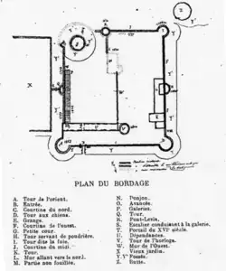 Voici la description du château tel qu’il était en 1656 d’après le procès-verbal d’état des lieux lors de l’érection du Bordage en marquisat (résumé de Guillotin de Corson et plan dessiné par Paul Sébillot en 1891).