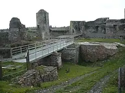 L'accès à la haute-cour était gardé par un châtelet d'entrée avec une passerelle. Celle-ci va connaître plusieurs phases : dans une première, au XIIIe siècle, la passerelle s'appuie sur trois piles de soutien, peut-être doublées par un pont-levis manipulé depuis le châtelet. La première pile côté basse-cour se voit transformée en culée aux alentours du XVe siècle[56]. Enfin, plus tard, la première pile côté haute-cour est elle aussi transformée en culée, traduisant l'abandon d'un éventuel pont-levis dans une période plus moderne[57].