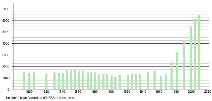 1. Dans le tableau des recensements et le graphique, par convention dans Wikipédia, le principe a été retenu, pour les populations légales postérieures à 1999 de n’afficher dans le tableau des recensements et le graphique que les populations correspondant à l'année 2006, première population légale publiée calculée conformément aux concepts définis dans le décret no 2003-485 du 5 juin 2003, et les années correspondant à une enquête exhaustive de recensement pour les communes de moins de 10 000 habitants, ainsi que la dernière population légale publiée par l’Insee.