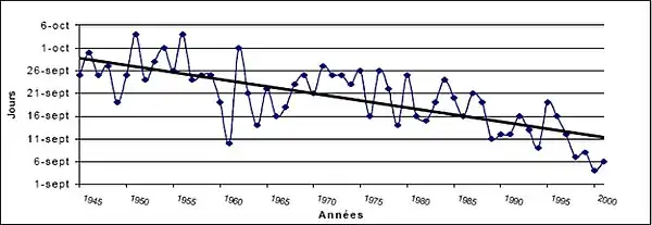 - 1 2 (fr) Service technique Inter Rhône, « Évolution de la date de vendange à Châteauneuf-du-Pape de 1945 à 2003. »(Archive.org • Wikiwix • Archive.is • Google • Que faire ?), Climat, CNRS (consulté le ).