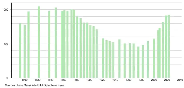 L'évolution du nombre d'habitants est connue à travers les recensements de la population effectués dans la commune depuis 1793. Pour les communes de moins de 10 000 habitants, une enquête de recensement portant sur toute la population est réalisée tous les cinq ans, les populations de référence des années intermédiaires étant quant à elles estimées par interpolation ou extrapolation[15]. Pour la commune, le premier recensement exhaustif entrant dans le cadre du nouveau dispositif a été réalisé en 2008[16].