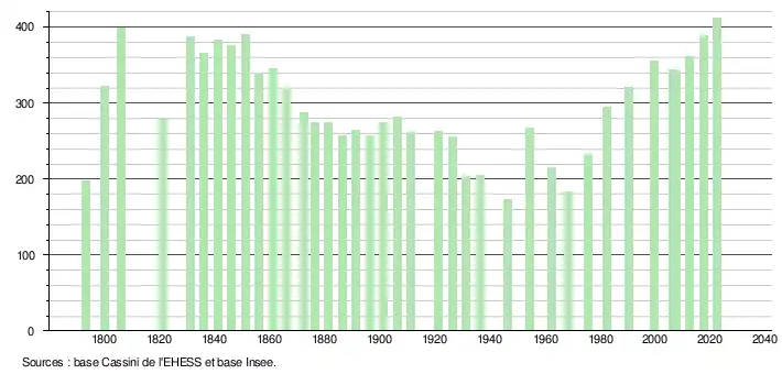 L'évolution du nombre d'habitants est connue à travers les recensements de la population effectués dans la commune depuis 1793. Pour les communes de moins de 10 000 habitants, une enquête de recensement portant sur toute la population est réalisée tous les cinq ans, les populations de référence des années intermédiaires étant quant à elles estimées par interpolation ou extrapolation[14]. Pour la commune, le premier recensement exhaustif entrant dans le cadre du nouveau dispositif a été réalisé en 2007[15].