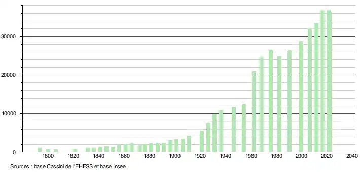 L'évolution du nombre d'habitants est connue à travers les recensements de la population effectués dans la commune depuis 1793. Pour les communes de plus de 10 000 habitants les recensements ont lieu chaque année à la suite d'une enquête par sondage auprès d'un échantillon d'adresses représentant 8 % de leurs logements, contrairement aux autres communes qui ont un recensement réel tous les cinq ans[33],[Note 4].
