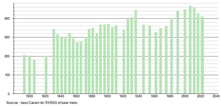 L'évolution du nombre d'habitants est connue à travers les recensements de la population effectués dans la commune depuis 1793. Pour les communes de moins de 10 000 habitants, une enquête de recensement portant sur toute la population est réalisée tous les cinq ans, les populations de référence des années intermédiaires étant quant à elles estimées par interpolation ou extrapolation[18]. Pour la commune, le premier recensement exhaustif entrant dans le cadre du nouveau dispositif a été réalisé en 2006[19].