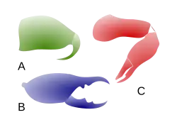 Lors du développement embryonnaire, la chélicère d'abord placée derrière l'ouverture buccale devient peu à peu un appendice pair au fur et à mesure de l'évolution des membres alentour.