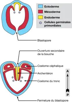 Une blastula avec un blastocœle étroit se développe. Au stade de 64 cellules, le déterminant des lignées germinal, un corps rond et petit formé après la fécondation près du pôle végétal, se divise pour la première fois et est distribué dans deux blastomères, les futures cellules germinales primordiales (CGP)[8]. Au stade suivant, une invagination typique forme la gastrula. Deux invaginations antéro-latérales de l’endoderme forment ensuite deux plis qui migrent vers le blastopore directement à l’intérieur de l’archentéron. Ces plis poussent à leur pointe les CGP qui se divisent à nouveau. Il s’agit là d’une forme particulière d’entérocœlie dans laquelle le mésoderme se forme par des plis qui migrent à l’intérieur de l’archentéron, plutôt que par la formation de poches qui envahissent le blastocœle.