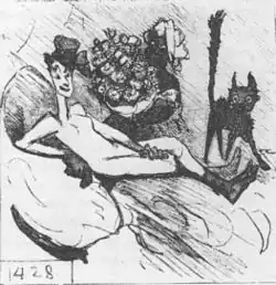 Olympia d'Édouard Manet (Salon de 1865) et caricature de ce tableau par Cham dans Le Charivari du [10]. Cham était connu pour ses caricatures féroces des tableaux exposés au Salon. | ||