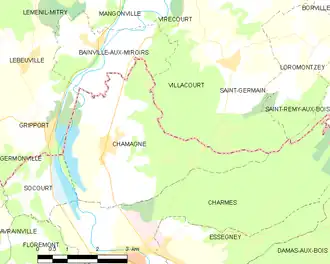 Chamagne est le dernier village traditionnel rural vosgien situé sur la rive droite de la Moselle avant que la rivière pénètre en Meurthe-et-Moselle. Socourt et Gripport lui font face sur la rive gauche.