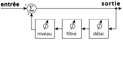 Une boucle de rétroaction (feedback) permet d'injecter ce nouveau signal dans le signal d'entrée. Dans ce cas, on entend un nombre multiple de répétitions, dont le niveau décroit à chaque fois jusqu'à devenir inaudible.