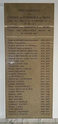 Un arrêté du préfet de la Marne en date du 3 décembre 1801, crée à Reims un conseil de Commerce composé de 9 personnes. Son rôle est d'améliorer le commerce et les manufactures[2].