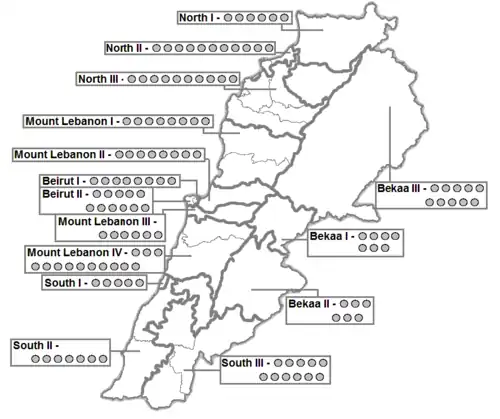 En accord avec la pratique libanaise du confessionnalisme politique, les communautés religieuses libanaises se répartissent des sièges réservés dans les différentes circonscriptions suivant leur poids démographique. La répartition des voix se fait à la proportionnelle. Une fois l'ensemble des bulletins de vote dépouillés, le total des votes valides dans chaque circonscription est divisé par le nombre de sièges à pourvoir, ce qui donne en voix le seuil électoral nécessaire pour qu'une liste obtienne un siège. La répartition des sièges se fait entre les listes ayant atteint ce quorum de manière proportionnelle selon le pourcentage de voix obtenu, puis au sein des listes en accord avec les quota confessionnels et le nombre de votes préférentiels obtenus par les candidats[2].