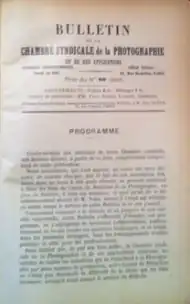La Chambre syndicale de la photographie rassemble photographes, fournisseurs de produits chimiques et vendeurs d’appareils. Par la suite, la Chambre obtient le soutien des milieux artistiques, notamment d’artistes contemporains tels Bouguereau, Puvis de Chavannes, Hébert ou Falguière[2]. De grands noms de la photographie commerciale vont rejoindre la chambre syndicale : Jean Nicolas Truchelut qui fut président en 1880, Paul Nadar, Georges Giraudon, Jacques-Ernest Bulloz y adhère grâce au parrainage de son oncle Gaston Braun, le fils d’Adolphe Braun, et de Léon Vidal. La Chambre syndicale de la photographie changea de dénomination à plusieurs reprises. Elle sera notamment rebaptisée en 1890 en Syndicat général de la photographie.