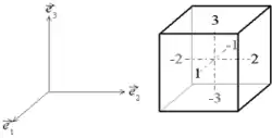 - les faces i et −i sont les faces normales à , en partant du centre du cube, pointe vers i, la face −i étant la face opposée.