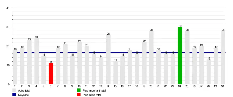 Ce graphique représente le nombre de buts marqués lors de chaque journée. Le total est de 600 buts, ce qui donne une moyenne de 2,5 buts par match.