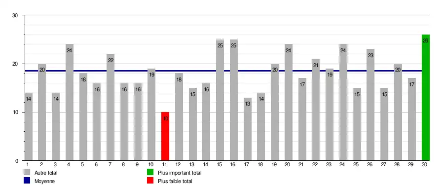 Ce graphique représente le nombre de buts marqués lors de chaque journée, soit un total de 556 buts (moyenne de 18.5 buts par journée).