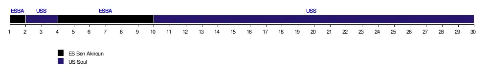 | Résultats (▼dom., ►ext.) | ASO | CRB | CSC | ESBA | ESS | JSK | JSS | MCA | MCEB | MCO | NCM | PAC | USB | USMA | USMK | USS |