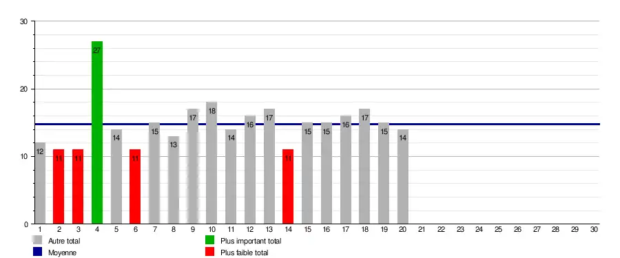 Ce graphique représente le nombre de buts marqués lors de chaque journée, soit un total de 299 buts (moyenne de 14.8 buts par journée).